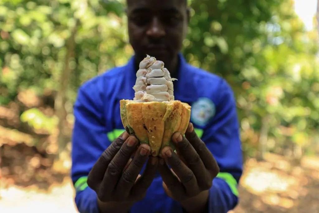میوه کاکائو در دستان کشاورزی در مزرعه – کامرون