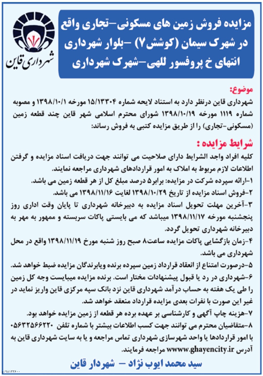 شهرداری قاین در نظر دارد چند قطعه زمین (مسکونی – تجاری) را از طریق مزایده کتبی به فروش رساند: