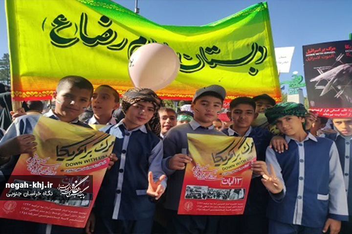 بیرجند - راهپیمایی ضد استکباری یوم الله ۱۳ آبان با حضور پرشور نوجوانان، جوانان و اقشار مختلف مردم بیرجند به ویژه دانشجویان و دانش آموزان از میدان ابوذر به سمت میدان قدس این شهر آغاز شد و فریاد مرگ بر آمریکا در این دیار طنین‌انداز شد.