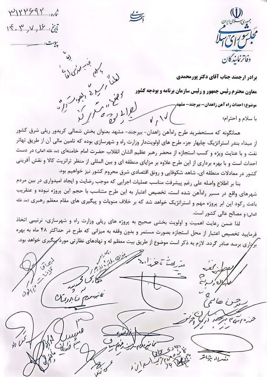 نمایندگان استانهای خراسان جنوبی و رضوی با ارسال نامهای به معاون رئیسجمهور و رئیس سازمان برنامه و بودجه، نسبت به کندی تخصیص اعتبارات به پروژه راهآهن زاهدان-بیرجند-مشهد انتقاد کرده و بر لزوم تأمین بهموقع بودجه برای تکمیل این پروژه در بازه ۴۸ ماهه تأکید کردند.